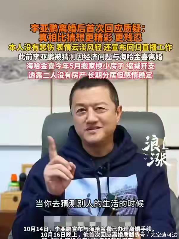 “猜想永远不如真相更精彩或残忍!”李亚鹏的回应刚出,就把离婚风波的讨论引向了新方向。10月16日,官宣离婚仅两天的他,在直播间预热视频里首度回应质疑,没有哭诉也没辩解,却用一句话点醒了无数追着八卦的人。