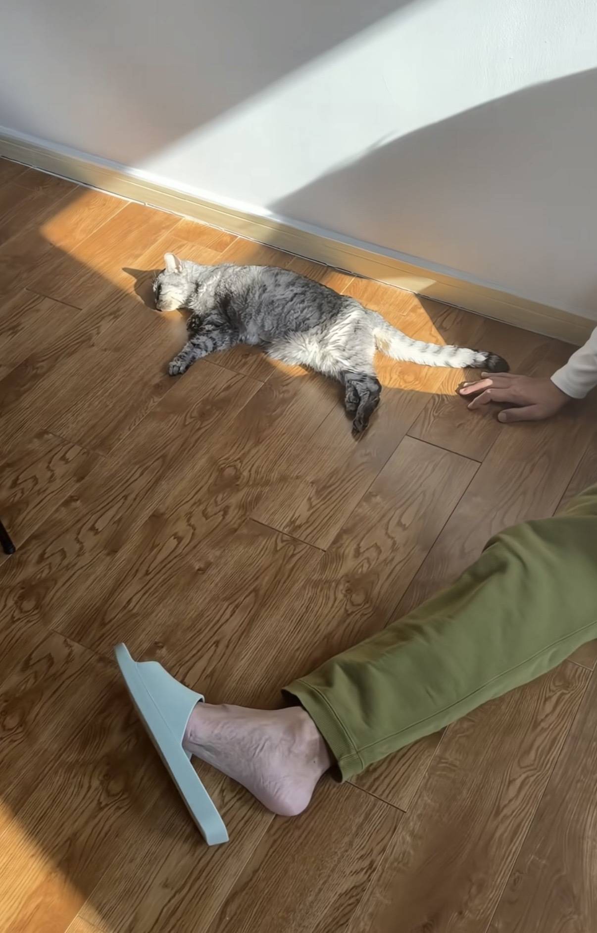 王冠还晒出了老公陪伴小喵的画面,这是一只黑白色的小喵,它躺在地板上晒太阳的模样很慵懒,看着软绵绵的。李先生用手指抚摸他的头,小喵乖乖的、一动不动。